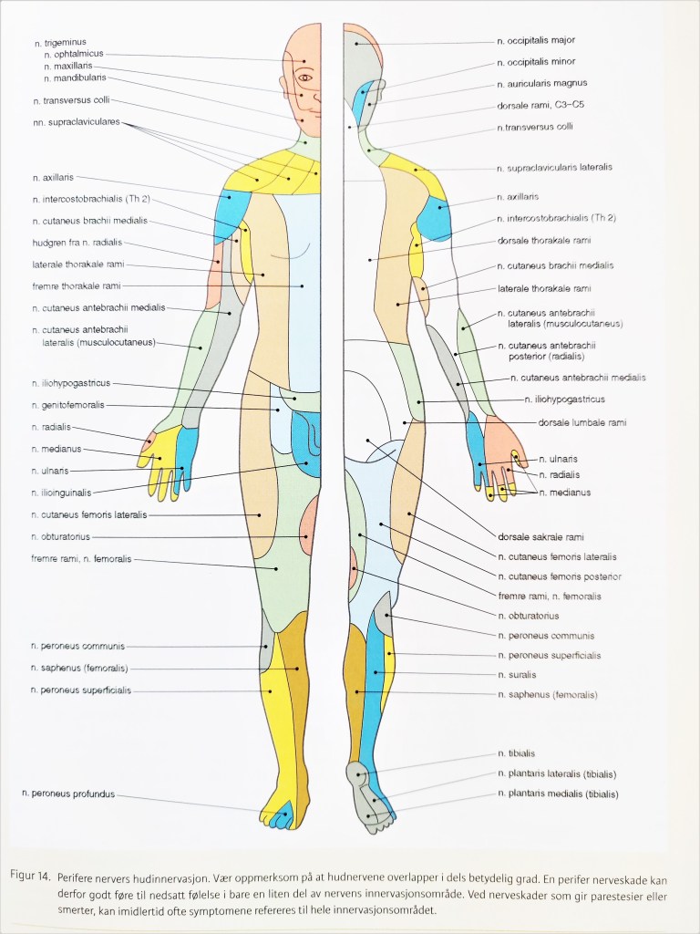 Er flere dermatomer affisert, og dette følger kartet til en perifer nerve, kan det tyde på affeksjon av nerven (13).