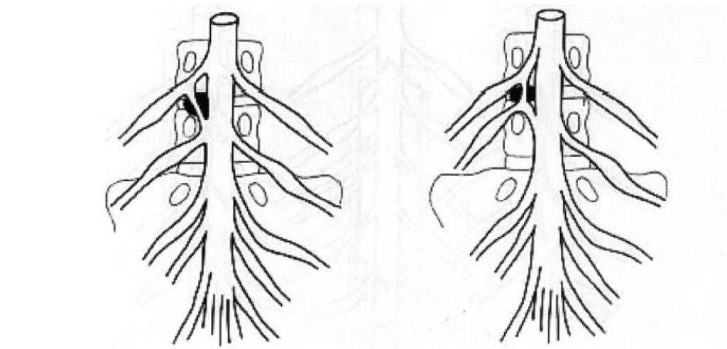 Noe som kan bidra til variasjon er anastomoser mellom bakhornene. I en studie så man at 22 % av lumbale dorsale røtter kommuniserte med nabosegmentet via anastomoser (4).