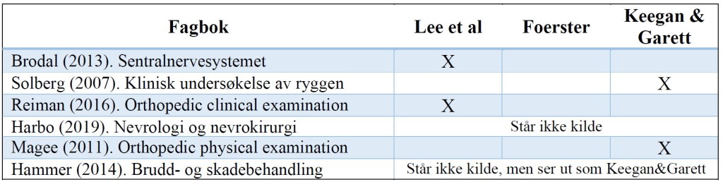 Som man kan se er det mange som fortsatt bruker Keegan & Garett. Et eksempel på hvordan den kliniske resonneringen kan forringes er ved en L4-nerverotsaffeksjon. Bøker som bruker Foerst sitt kart (bla. Lee et al) viser ingen L4 dermatom på låret. Ser du i andre bøker kan du få resultatet om at det er affeksjon av L2, L3, L4 eller L5 – alt avhengig av hvilken kilde du bruker (8). Dette kan forvirre!