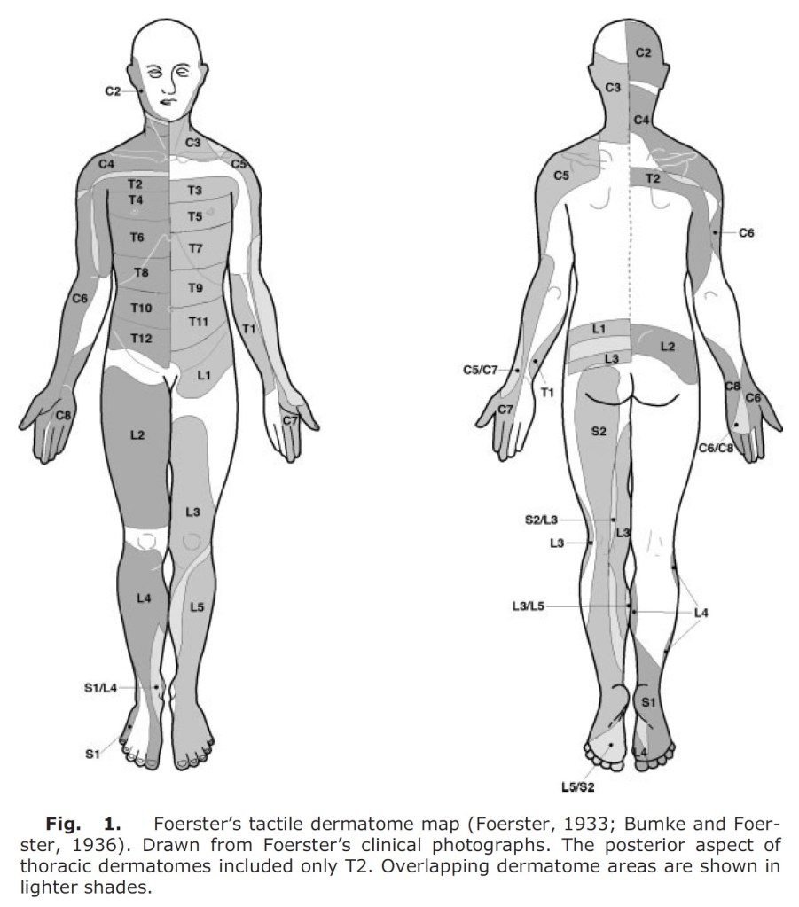 Foerster fant ut at dermatomer varierer fra person til person (utenom midtlinjen), at taktile dermatomer overlapper i større grad enn de bestemt av smerte og temperatur og at det ikke er totalt tap av sensibilitet hvis man kutter én nerverot (utenom C2) (4). En uetisk og fæl studie, men den har allikevel dannet grunnlaget for dermatomkartene vi ser nå.