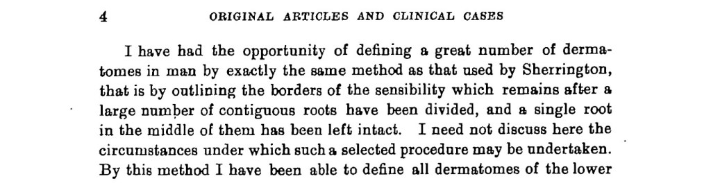 Videre avansement av kunnskap ble gjort av Sherrington på slutten av 1800-tallet, som forsket på dermatomene hos aper. Han kuttet flere nerverøtter over og under en viss rot, og undersøkte hvordan nervefunksjonen til resterende nerverot var (2).