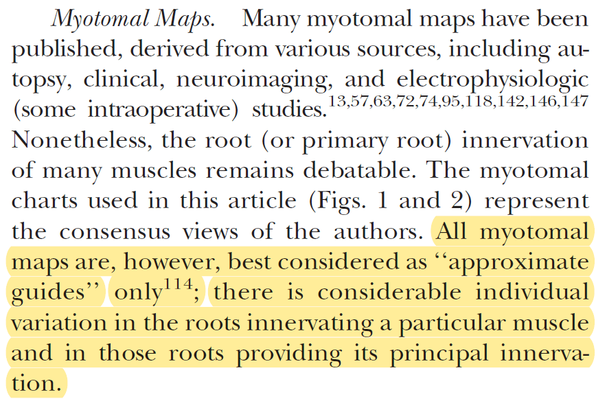 På samme måte som at man har et dermatomkart for test av sensibilitet kan man tenke at man har et myotomkart for kraftprøver. Hvis en muskel er svak, hvilken nerverot er i klem? Typisk lærer man en viss regle på studiet, f.eks. quadriceps L4, tibialis anterior L5 og triceps surae S1. Graver man dypere i litteraturen er det ikke så svart-hvitt.