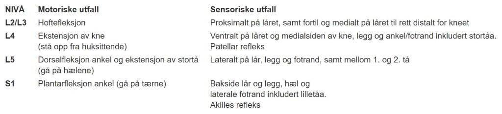 De så at det i mange tilfeller var et bredere spenn for hvilke nerverøtter som innerverer muskulatur (12). Eksempelvis så de at en stor del av innerveringen av quadriceps kom fra L2, L3 og L4, men også litt fra L1. Se skjema for detaljer.