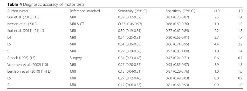 Det gir mening at man ikke alene kan diagnostisere en skiveprolaps og radikulopati ut i fra kraftprøver alene. Det vil selvsagt være mer sikkert hvis man inkluderer testing av reflekser, følsomhet og nevrodynamikk vil være bedre. I et testbatteri øker spesifisiteten til 0.90, 0.83 og 0.94 for å diagnostisere skiveprolaps og radikulopati L4, L5 og S1 (11).