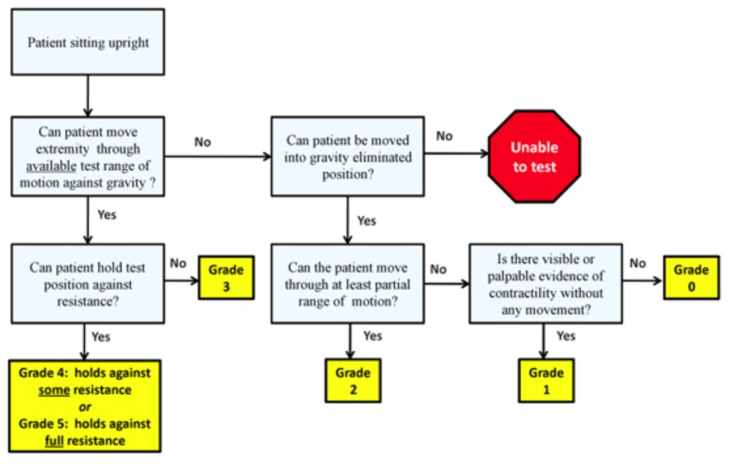 MRC-skalaen er en gammel skala, den ble først publisert i 1943 (4). Det har blitt foreslått mange andre skalaer og varianter av denne skalaen, men ingen har «tatt over» tronen (5). Det er denne skalaen som brukes av fysioterapeuter og leger for å kommunisere funn ved skiveprolaps og radikulopati. Den graderes fra 0 til 5, der 0 er ingen synlig muskelkontraksjon (paralyse) og 5 er der pasienten kan holde mot full motstand. Det er viktig å be pasienten ta i ordentlig.