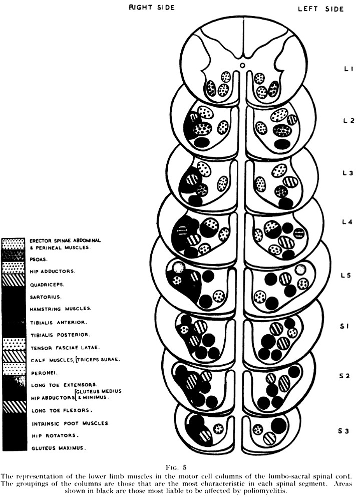 Resultatene fra denne studien stemmer også godt med resultatene fra en gammel studie som undersøkte hva slags nevrologisk utfall polio-pasienter fikk (14). Polio-viruset kan angripe og ødelegge de motoriske forhornceller i ryggmargen (15). De så at noen muskler hadde lange «motorcellekolonner», altså de strakk seg lengre aksialt, f.eks. hoftefleksorer og adduktorer. Selv ved angrep av polio på nerverøtter som innerverte disse musklene så ble de ikke paralytiske. Muskulatur som ble innervert av korte motorcellekolonner hadde større sannsynlighet for å være paralytiske, f.eks. tibialis anterior, tibialis posterior, peroneusmuskulatur og de lange musklene til tærne (14).