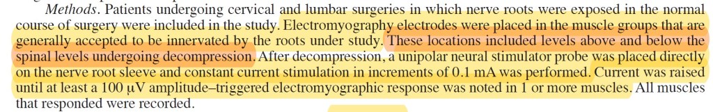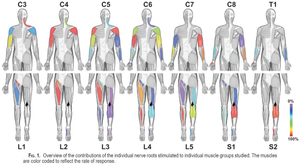 En av de mest omfattende studiene har blitt gjort av Schirmer mfl. (2011) (12). De gjorde 1589 stimuleringer av nerverøtter hos pasienter som skulle opereres, for så å registrere elektrisk aktivitet i muskulatur.
