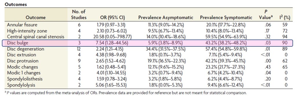 Det er ut i fra disse tallene ganske stor forskjell på prosentandel skivebukning hos de som har plager versus de som ikke har plager: 5,9 % hos asymptomatiske og 43,2 % av symptomatiske. Jeg vet ikke hvor de får tallet 5,9 % hos asymptomatiske fra, for meg virker det veldig lavt sammenlignet med de andre studiene jeg har nevnt, f.eks. Boden et al.