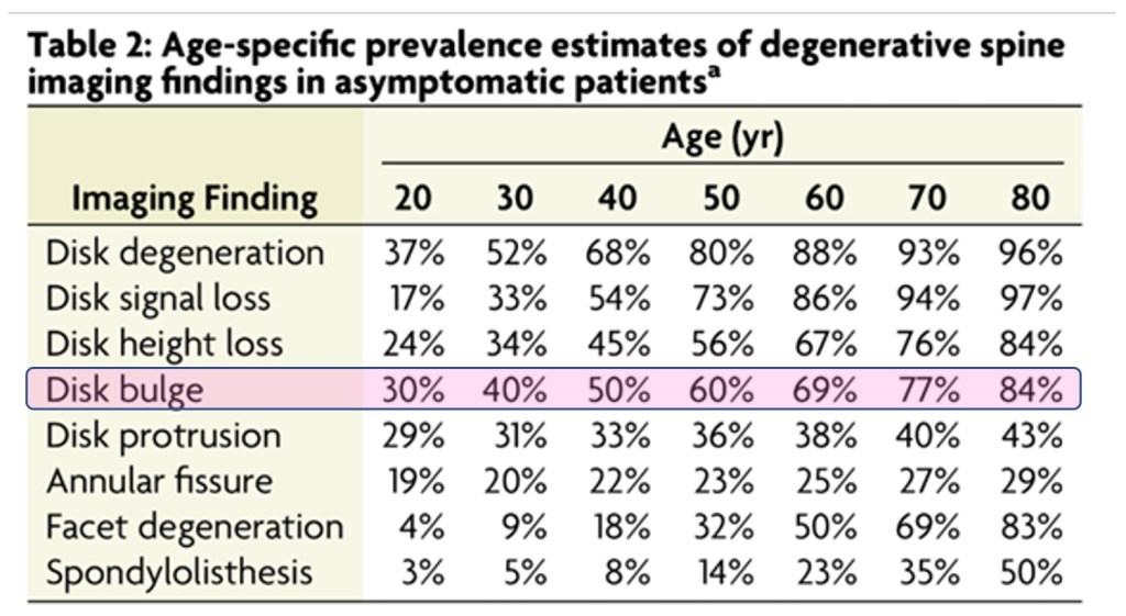 En studie som mange MSK-klinikere nok kjenner til er denne av Brinjikji (5) som gjorde en systematisk oversiktsartikkel over MR-funn i korsrygg av folk uten korsryggsmerter: