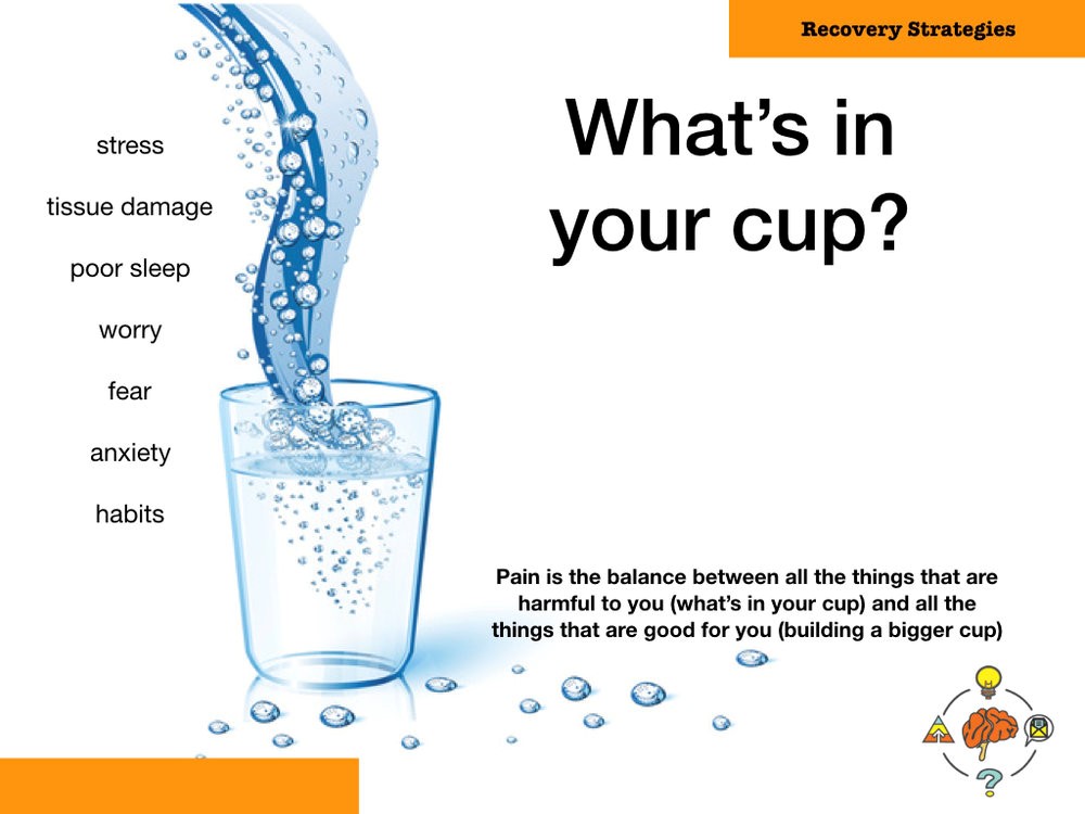 Jeg bruker også modellen til Greg Lehman (eller noen før han?) for å beskrive veien for bedring: Vann- og koppmetaforen (10). Du kan bygge en større kopp (øke kapasitet) eller ta vekk noe av vannet (stressor). Les hans artikkel på dette her.
