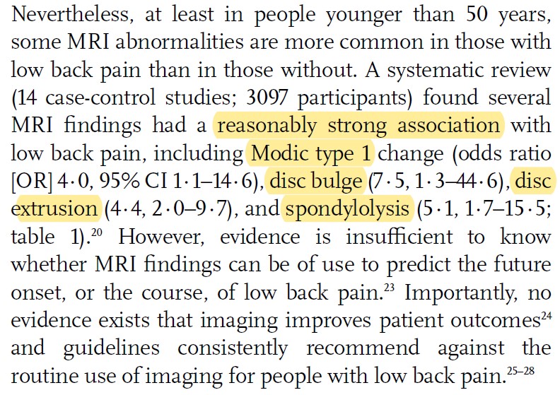 I Lancet-artikkelen fra 2018 står det også at noen MR-funn, blant annet skivebukning, har ganske sterk assosiasjon med korsryggsmerter (7).