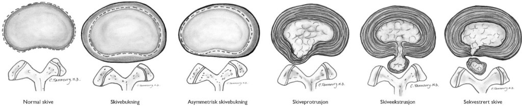 Som kliniker har du sikkert hørt pasienten si at de har tatt MR som viser skivebukninger og at det er dette som gir plagene. Noen kan til og med si at de har prolaps, når MR viser skivebukning. Er skivebukning det samme som prolaps, og gir dette smerter? Først må vi ta et lite tilbakeblikk på hva som er hva.