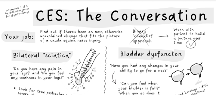 Det er ikke noe fasit på hvordan CES kan utvikle seg, og det er ikke en svart/hvitt sjekkliste man kan bruke. Man bør samarbeide godt med pasienten og danne seg en tidslinje over når de forskjellige symptomene kom og hvordan det har artet seg. Det er viktig å spørre om isjias, blære (husk, urinretensjon er når du IKKE klarer å tisse), tarm, sensibilitet i ridesalområdet (ridesal er kanskje et bedre ord enn ridebukseområdet. Hva er en ridebukse?) og seksualfunksjon (2). Jeg vil anbefale å se nærmere på International Framework for Red Flags for Potential Serious Spinal Pathologies (2), eventuelt ta en titt på Tom Jessons infografikk her eller kjøpe boka hans om cauda equina-syndrom her. Ved tegn til CES bør man henvise for øyeblikkelig hjelp til sykehus for MR og kirurgisk vurdering. Ofte vil de ta ultralyd av blæren på sykehuset for å se om du har urinretensjon. Hvis du vurderer pasienten til å være i risikosonen for å seinere utvikle CES er det nødvendig med et sikkerhetsnett, det vil si informere godt om hvilke symptomer å se etter og hva man skal gjøre hvis det dukker opp (ringe deg, sykehus, legevakt?) (2).