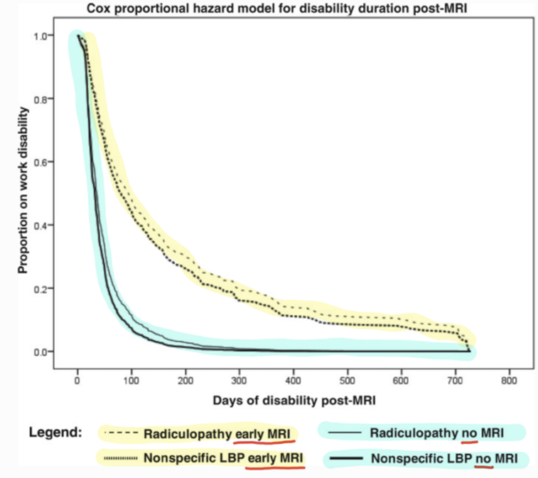 “Early MRI without indication has a strong iatrogenic effect in acute LBP, regardless of radiculopathy status. Providers and patients should be made aware that when early MRI is not indicated, it provides no benefits, and worse outcomes are likely.”