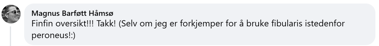 Aller først, en presisering: Ja, jeg har alltid tenkt at peroneus er best å bruke, men jeg ble gjort oppmerksom på at det helst bør kalles fibularis. Dette er fordi på engelsk kan «peroneal» forvirres med perineal, som er relatert til perineum (for de som ikke visste det, så er perineum området mellom anus og kjønnsorganene). Takk for presiseringen, Magnus!