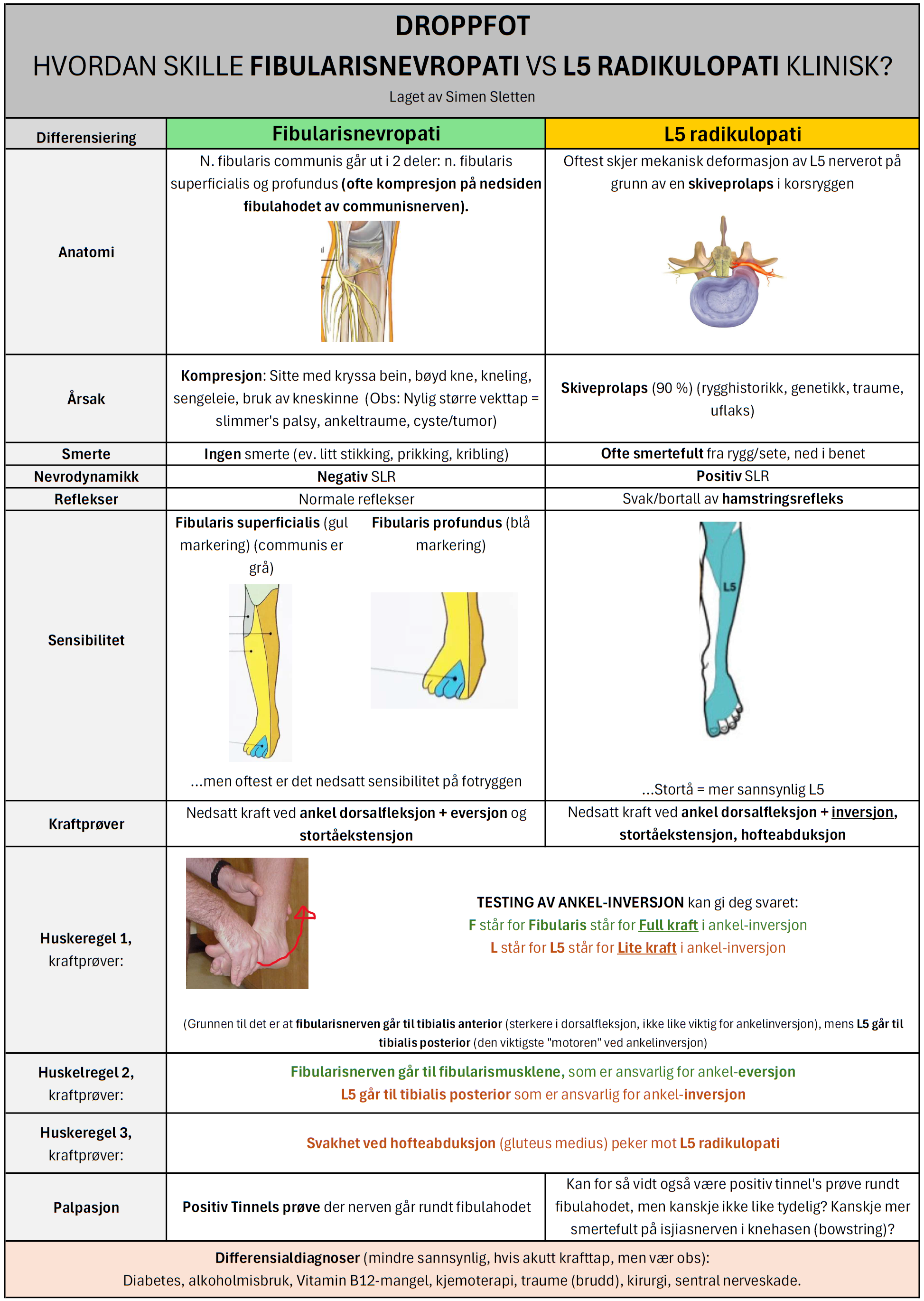 Lengre ned er en oversikt som jeg har laget for å differensiere mellom fibularisnevropati (peroneusnevropati) og L5-radikulopati i klinikken.